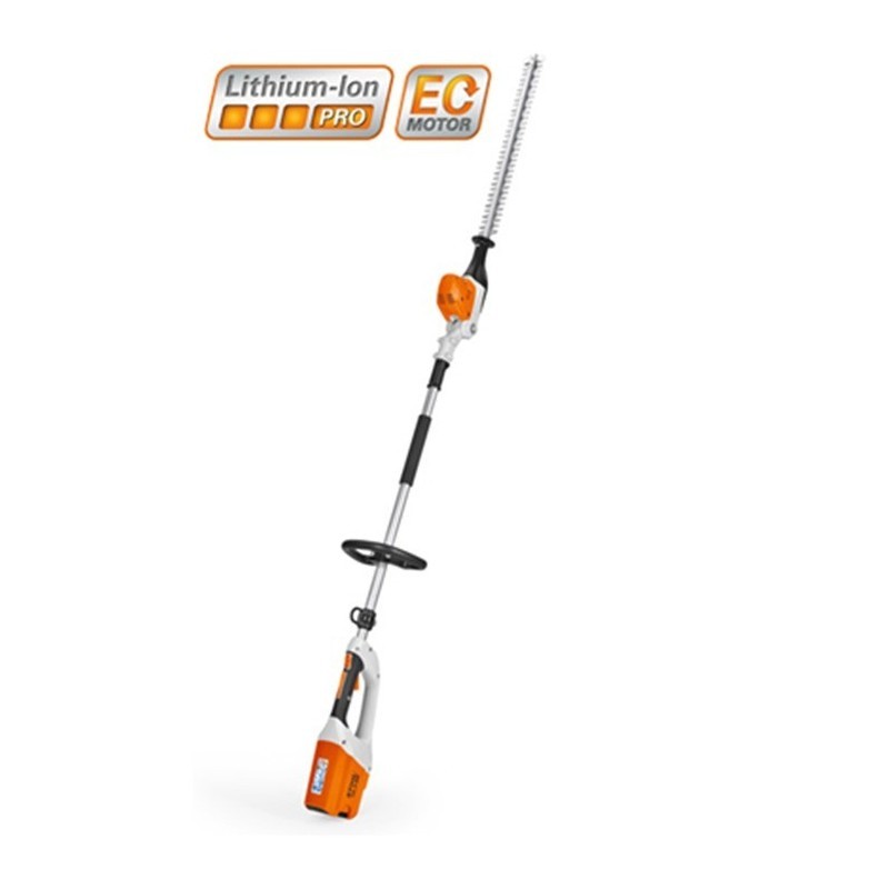 Taille-haie sur perche à batterie avec angle de barre de coupe réglable de -45 à +90°. Le tube est démontable pour faciliter le transport et la lame est à tranchant unilatéral en forme de goutte.