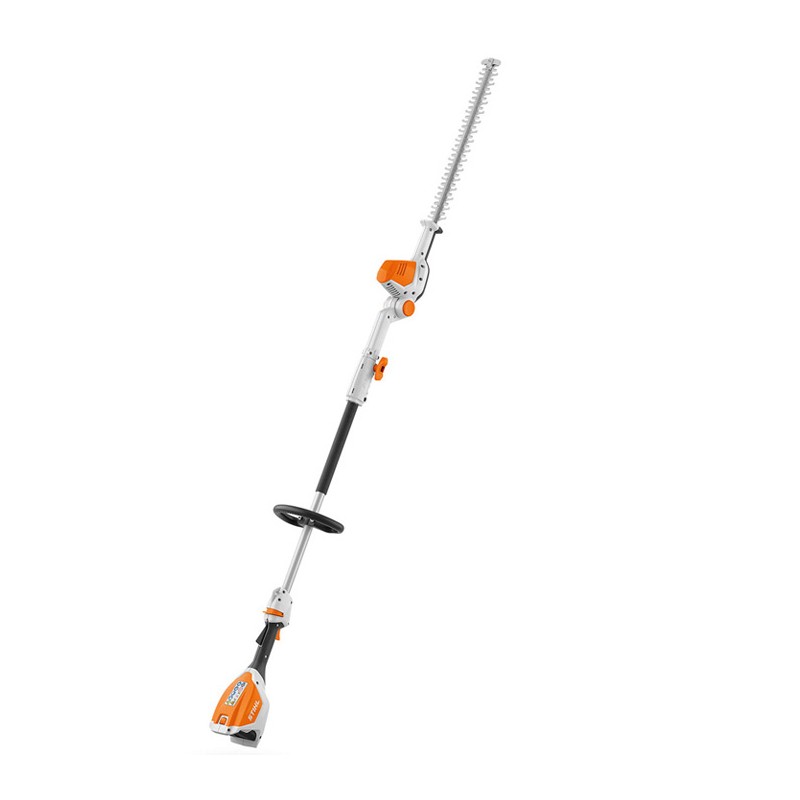 Taille-haie sur perche à batterie avec angle de barre de coupe réglable de -45 à +90°. Le tube est démontable pour faciliter le transport et la lame est à tranchant unilatéral en forme de goutte.